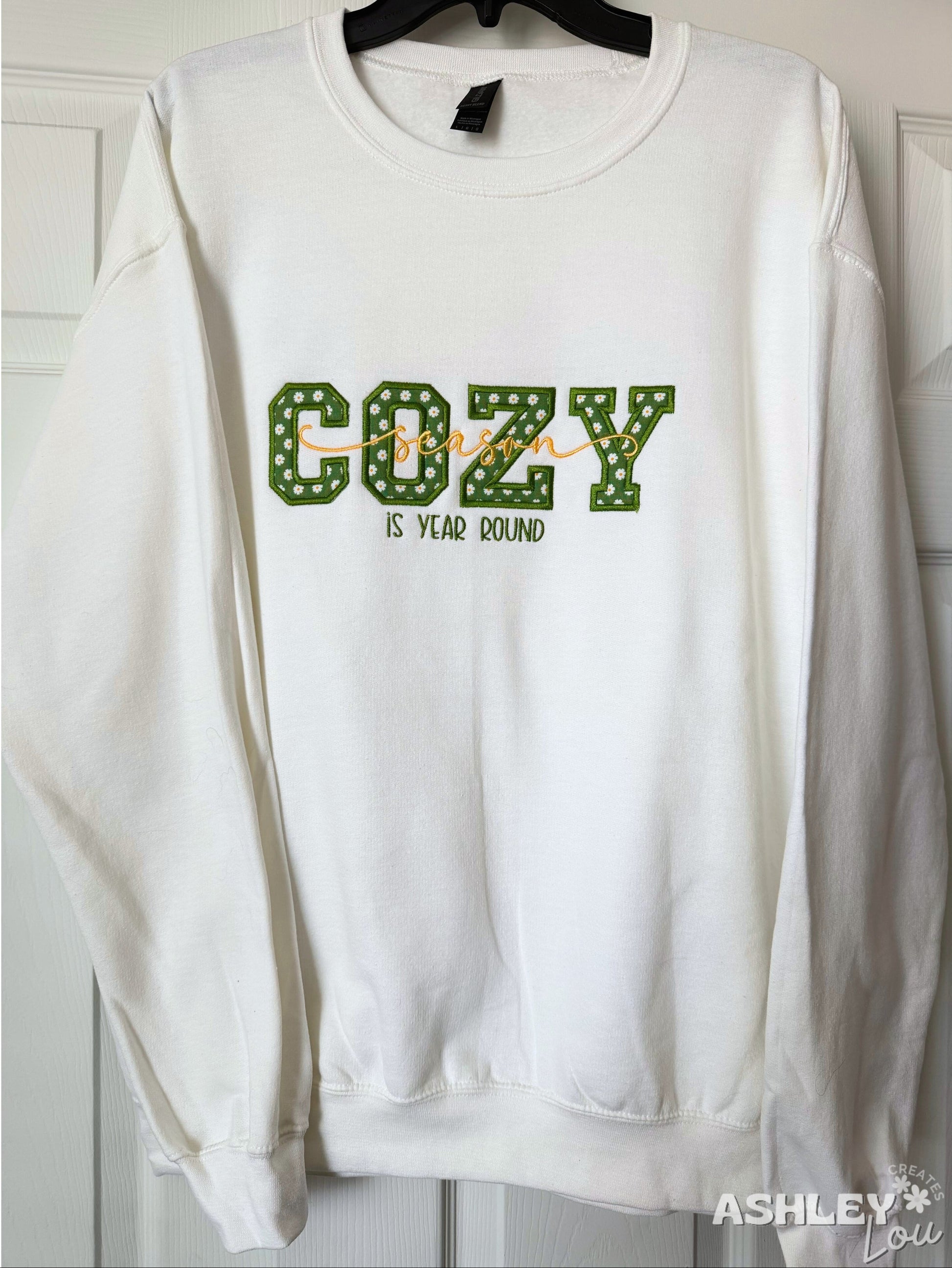 Wrap yourself in comfort with this “Cozy Season Is Year Round” appliqué embroidered sweatshirt, designed for readers, cozy gamers, and lovers of slow living. This cozy statement piece features fabric appliqué lettering using a soft daisy print, carefully stitched onto a white Gildan 18000 sweatshirt for a timeless, cozy look you can wear all year long.